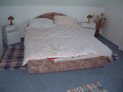 Dachgeschoss: Bad mit Dusche und WC, 2 Schlafzimmer: ein Schlafzimmer mit einem Doppelbett, und ein Schlafzimmer mit drei Einzelbetten.  Zum Haus gehört eine überdachte Terrasse mit Gartenmöbeln.  Im Hof kann man grillen und parken.