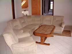 Dachgeschoss /äußere Treppe/: Wohnzimmer mit Sitzgarnitur und TV-Sat,