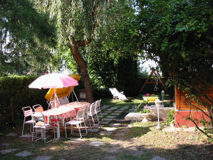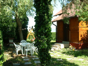 Planschbecken. Außerdem gibt es eine Spielecke mit Schaukeln und Klettergerüst.
