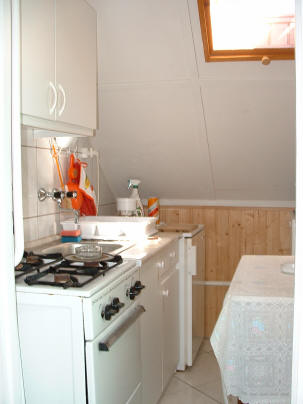 eine komplett eingerichtete Küche, eine geschlossene Terrasse als Wohnzimmer
