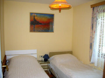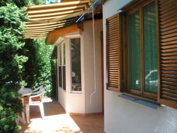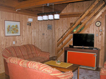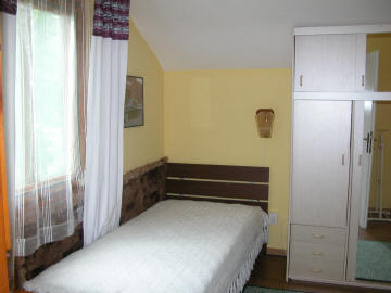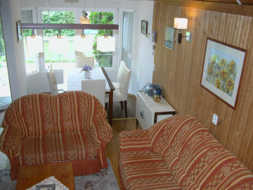 Haus mit Garten und Terrasse. Erdgeschoss: 1 Zweibettzimmer, Wohnzimmer, Küche, Dusche/WC, Obergeschoss: 2 Zweibettzimmer, WC, Balkon.