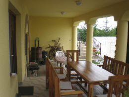 großer Hof mit Gartenbecken, Gartenmöbel, Grill, Sonnenliegen, Sonnenschirm,